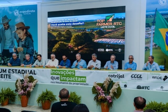 Mesa de abertura: Rodrigo Rizzo, coordenador das Comissões Temáticas da Farsul e presidente do Conseleite; Guillermo Dawson Jr., diretor superintendente da CCGL e coordenador do projeto SmartCoop; Marlon Bentlin, gerente regional do BRDE; Darci Hartmann, presidente do Sistema Ocergs; Eduardo Condorelli, superintendente do Senar- RS; Nei César Manica, presidente da Cotrijal; Caio Vianna, presidente da CCGL; Enio Schroeder, vice-presidente da Cotrijal; Paulo Pires, presidente da Fecoagro e Jair Mello, gerente de suprimento de leite da CCGL.