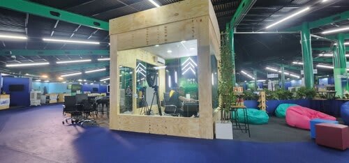 Focada na inovação e tecnologia, que o local recebe, a personalidade moderna era percebida logo na entrada, com a criação de um pórtico curvo com recepção em painel de led. E na parte interna, mais surpresas. Espaços instagramáveis, um estúdio todo montado para a realização de podcasts, que atualmente é uma das mídias mais acessadas, e um palco 360 graus ao centro da arena. “Buscamos sempre os detalhes para desenvolver os nossos designes. Fazemos uso de ferro industrial e outros materiais reutilizáveis, além de mobiliários diferenciados e iluminação cênica”, contou Aline Colombo, diretora da empresa.